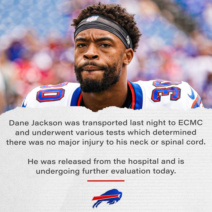 The Bills confirmed that there was no significant injury to Jacksons neck and that he was released from the hospital after undergoing a series of tests. He is undergoing a CT. -- Buffalo Bills cornerback Dane Jackson was released from the hospital on Tuesday after tests revealed he sustained no major.